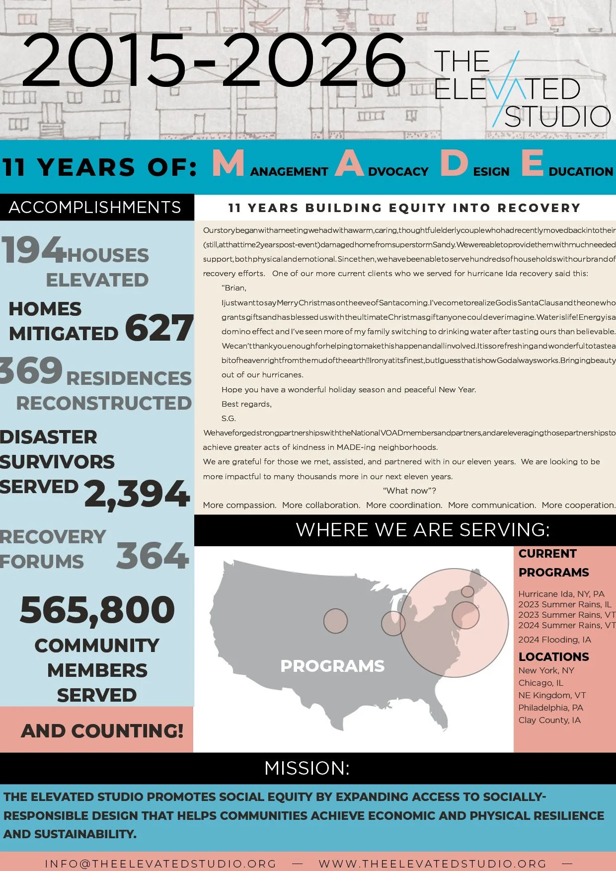 We believe that every member of a community should have access to and benefit from socially responsible design. We believe that social, economic, and physical resilience and sustainability are intertwined and must be within reach to all.